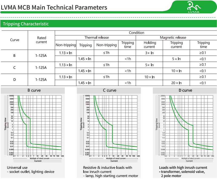 Type A: Trips at 2-3 in., suitable for semiconductor loads (such as inverters and rectifiers), preventing tripping due to minor overloads;