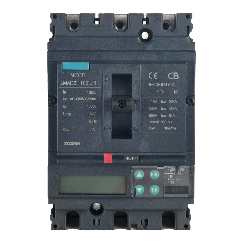 The LMM3Z series circuit breakers are also equipped with an intelligent controller, which not only increases the selection range of the setting current, but also has a liquid crystal display, overload setting current, short-circuit delay current, short-circuit instantaneous current and tripping time that can be set, short-circuit instantaneous three-stage protection and under-voltage protection; equipped with RS485 communication interface, MODBUS-RTU protocol; DL645 protocol, users can choose according to their needs. Remote signaling: breaking/closing, tripping, alarm and fault status indication; remote control: breaking, closing, reset; telemetry: three-phase current and N-phase current, grounding current, tripping memory function, and functions such as querying tripping record parameters, which further improves the reliability and continuity of power supply. This circuit breaker also has an isolation function (can be used instead of a load switch).