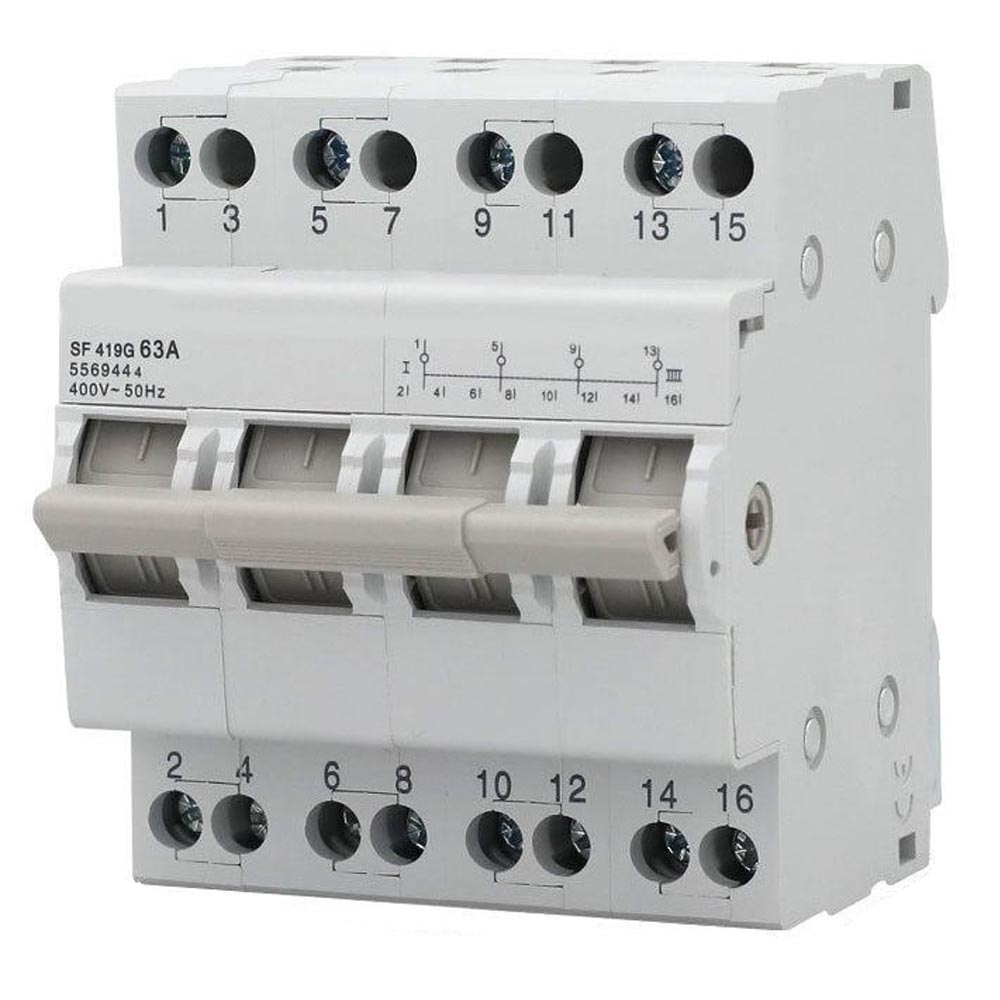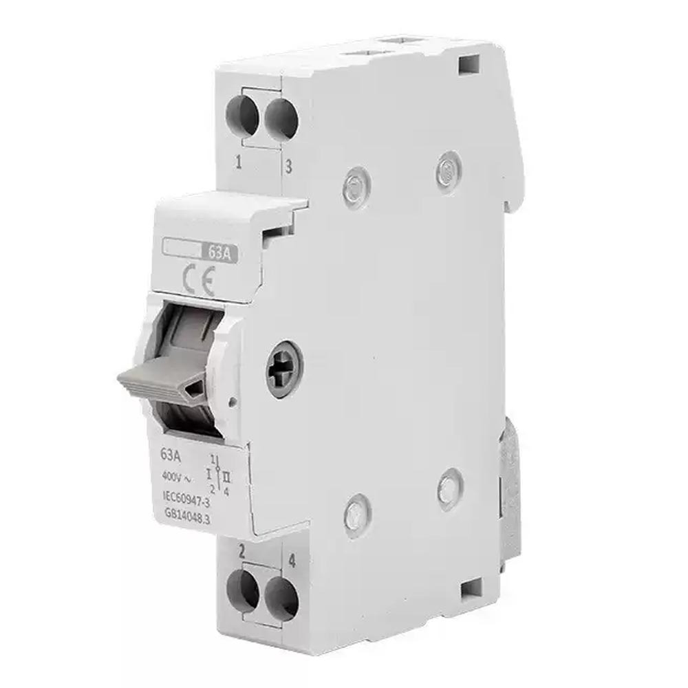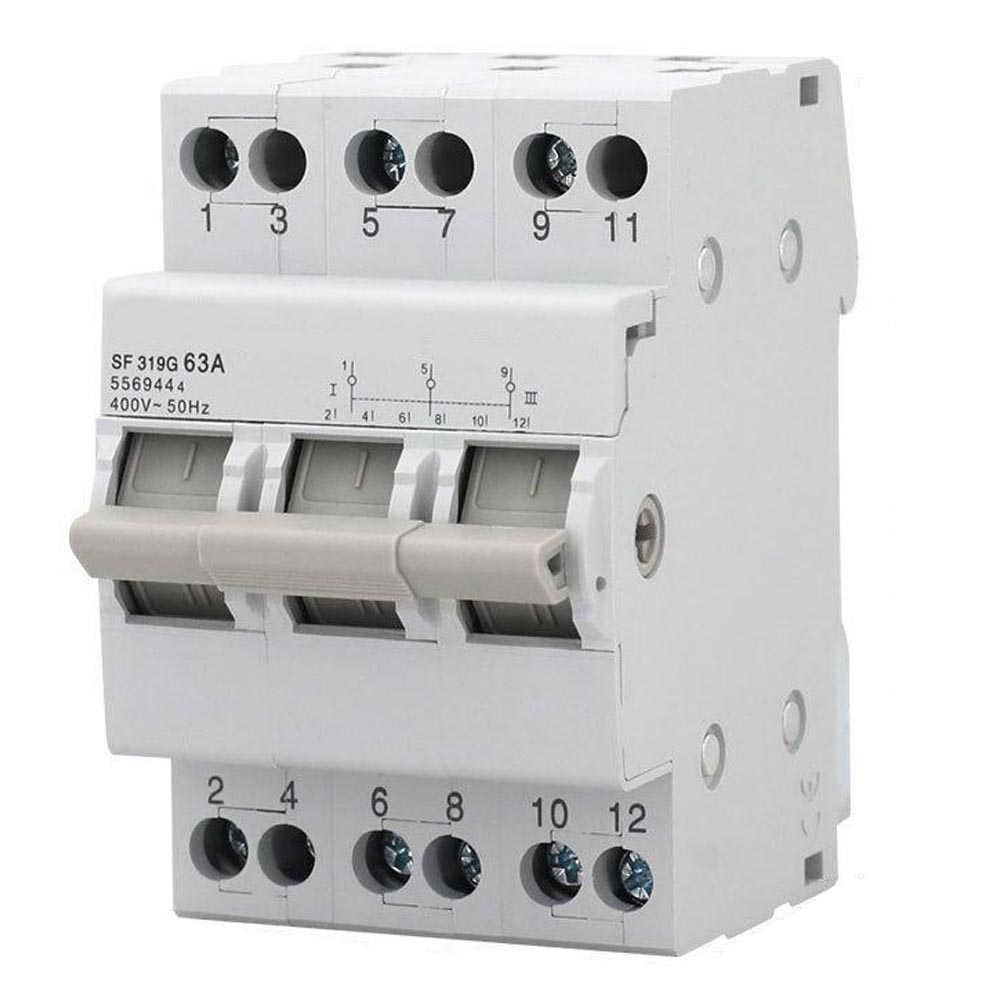 The SF219G is a rail-mounted manual dual power transfer/isolation switch (MTS/Changeover Switch) used for manual switching and isolation between two power sources. It is commonly found in distribution boxes, photovoltaic systems, and power distribution systems.